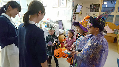 近所の商店さんにご協力いただき、ハロウィンパレードをしています。